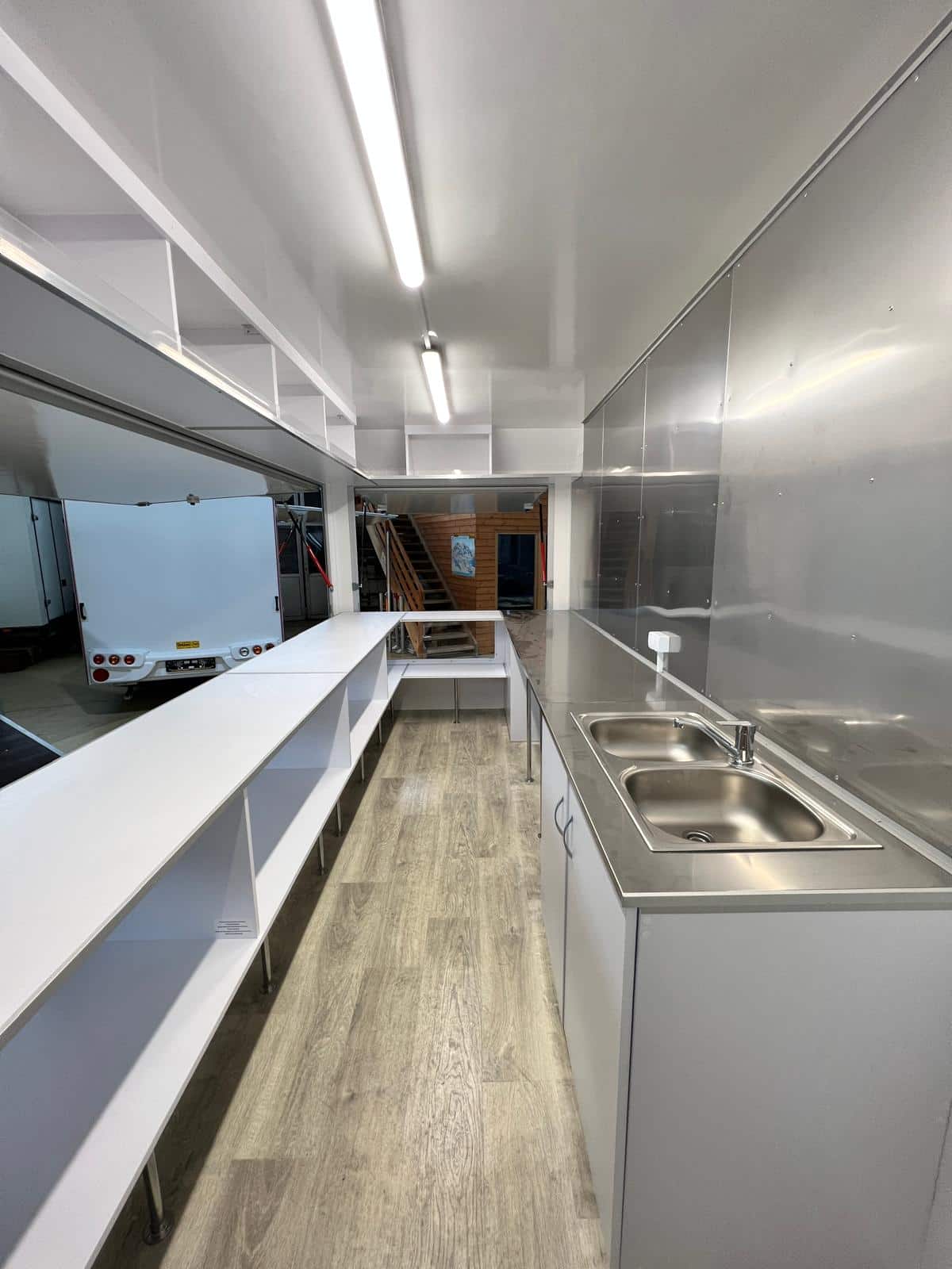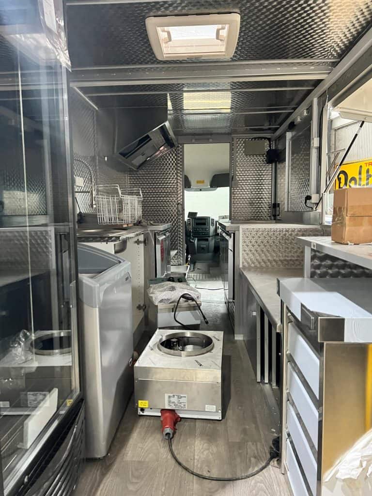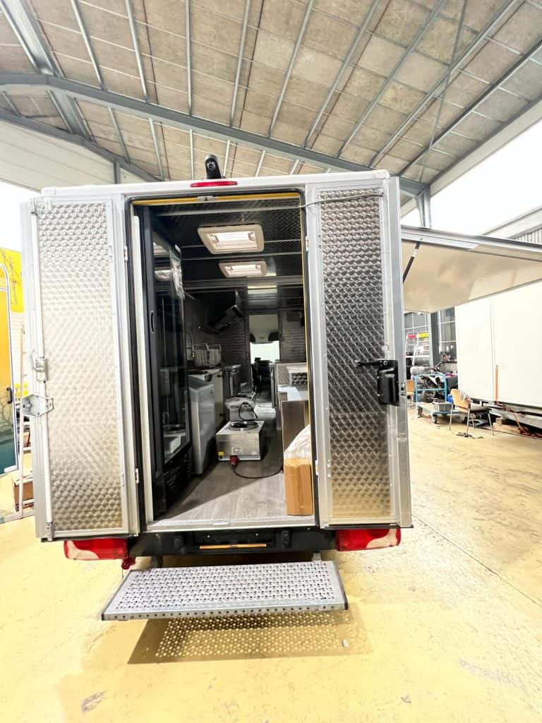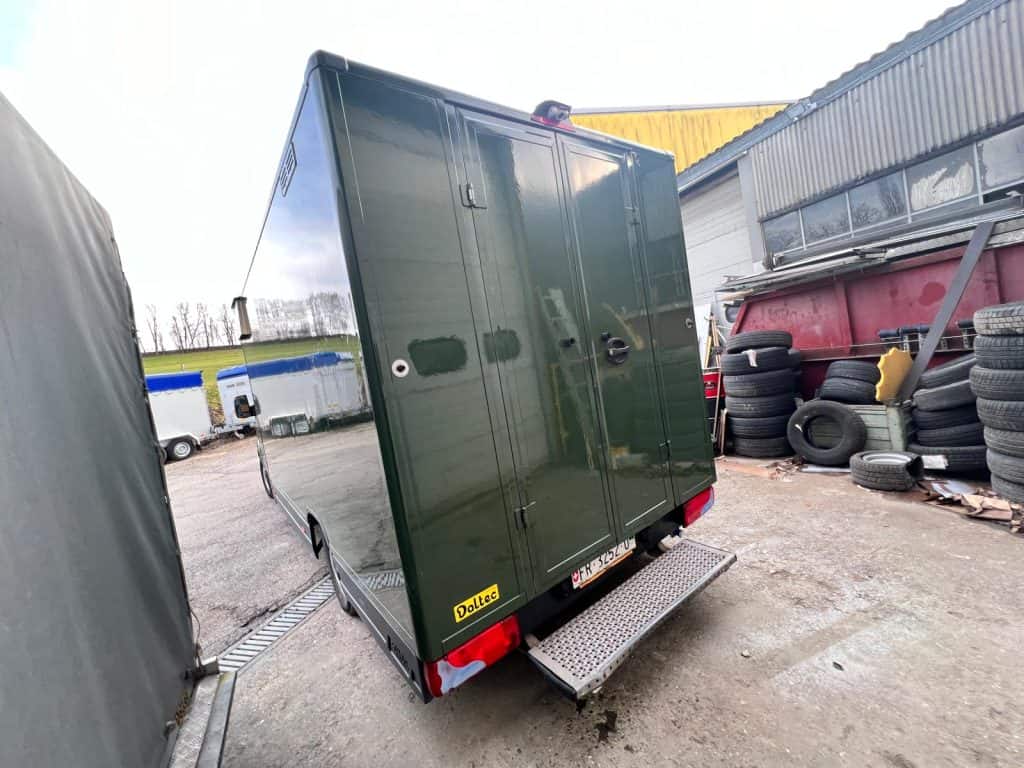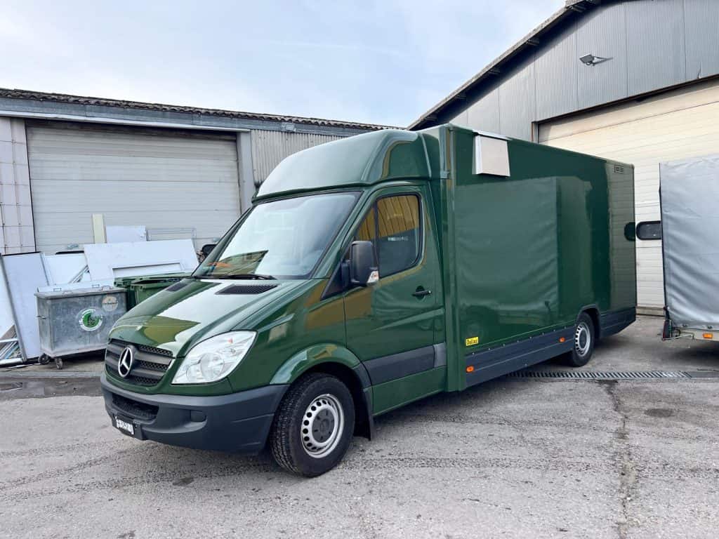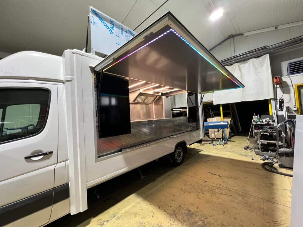 Auf Basis gebrauchter Kofferwagen komplett umgebaute und mit Profiküchen installierte Foodtrucks.