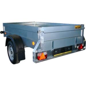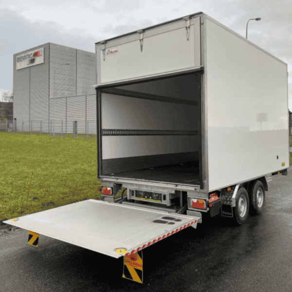 Hochlader mit Sandwichaufbau, hydraulische Hebebühne, Durchladesystem und robustes abkippbares Stützrad vorne.