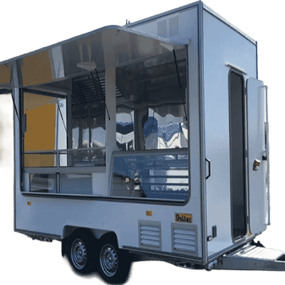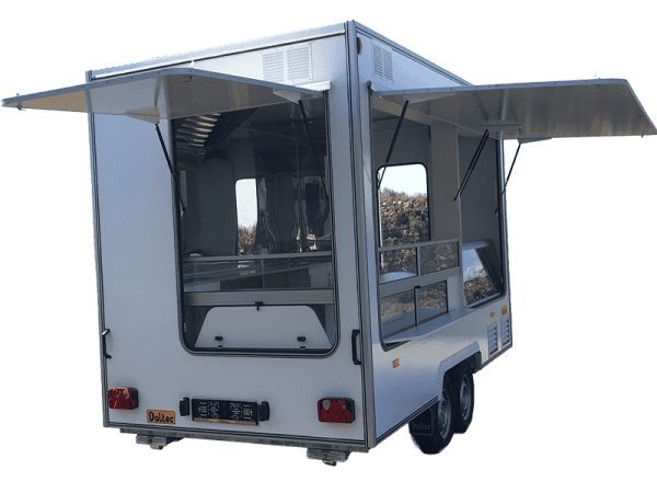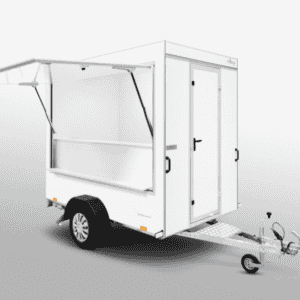 Fahrgestell: V-Anhängevorrichtung feuerverzinkt Kugelkupplung, Stützrad Abreissleine oder Kette 4 Kurbelstützen zum stabilisieren des Anhängers Achsen: Achse AL-KO/Knott mit Auflaufbremse Handbremse Rückfahrautomatik Boden: Siebdruckplatte mit PVC belegt Beleuchtungsanlage: Nach Normen der StVO, 12 V, 13 Pol-Stecker Aufbau: Aus weissen, isolierten Sandwichplatten aussen glatt Eckprofile aus Aluminium 1 abschliessbare Personentüre mit Trittbrett über Deichsel 2 Seiten aufklappbar, abschliessbar Ausstattung: Arbeitsfläche auf 3 Seiten Verkaufsvitrine seitlich mit Unterbauschränken und Sichtfenster Oben Ablage über der Verkaufsfläche. Einbauschrank hoch. Wasseranlage mit Durchlauferhitzer, mobile Kanister und Doppellavabo mit Mischbatterie in separatem Möbel. Taschenablage kundenseitig. Inox Kühlvitrine mit professionellem Kühlkompressor für Temperaturen bis -6 Grad. Wasseranlage und Inox Arbeitsfläche. Elektroanlage: 240 V mit Ausseneinspeisung, Sicherungskasten, 5 Steckdosen Innenbeleuchtung mit Schalter