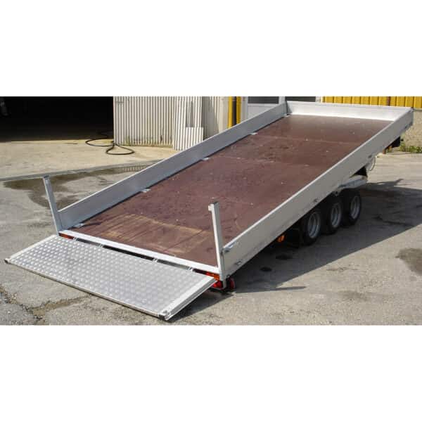 Für den Transport von etwas grösseren Fahrzeuge und Maschinen. Die Ladefläche ist hydraulisch abkippbar und die Heckrampe überfahrbar. Serienmässig mit einem Reling ausgerüstet für eine problemlose Befestigung der Fahrzeuge. Bei Bedarf können Seitenladen aus Aluminium zusätzlich montiert werden.