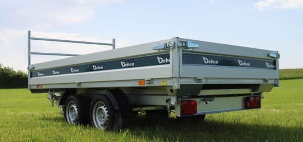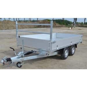 Fahrgestell: Grundrahmen feuerverzinkt, verschweisst und verschraubt, Solide V-Anhängervorrichtung, Abreissleine, Kugelkupplung, Verstärktes automatisches Stützrad, Elektrische Pumpe mit Batterie Achse: Robuste Achse Knott, Auflaufbremse mit Handbremse und Rückfahrautomatik Aufbau: Rahmen verzinkt, Alu-Bordwände 300 mm und Eckpfosten entnehmbar, 3 Seiten abklappbar – Vorne fix Multiplex Boden verstärkt mit Stahlblech belegt H-Gestell und Zurrösen Beleuchtungsanlage: Beleuchtung geschützt vorne und hinten, 12 V, Nach Normen der StVO, 13 Pol-Stecker