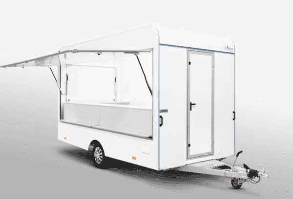 Ein zweiachsiger Anhänger mit 2 Verkaufsklappen.