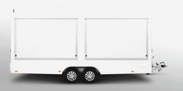 Ein zweiachsiger Anhänger mit 2 Verkaufsklappen.
