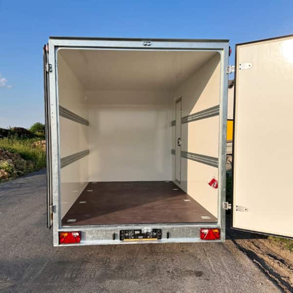 Châssis verzinkt, verschweisst und geschraubt. Auflaufeinrichtung KNOTT mit Kugelkupplung, Abreissleine, Handbremse und Stützrad TK48. Achsen Knott gebremst mit Rückmatik. Dach und Wände aus Sandwich Paneele, 30mm dick, weiss. Boden aus rutschfeste Siebdruckplatte. Doppelflügeltüren Hinten mit Drehstangenverschluss, abschliessbar. Servicetüre rechts, abschliessbar 2x Stützfuss Hinten mit Halter. 8x Bindeösen im Boden fixiert. 4x Zurrschienen (2 pro Seite) auf 650mm/1320mm Höhe montiert. 2x Lüftungen.