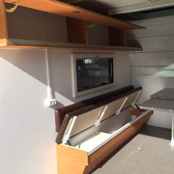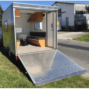 Fahrgestell: Grundrahmen feuerverzinkt, verschweisst und verschraubt V-Anhängervorrichtung verzinkt Kugelkupplung Abreissleine Stützrad Achsen: 1x Achse AL-KO / KNOTT Handbremse Rückfahrautomatik Aufbau: Heckrampe oder Kombi-Türe Halterungen und Verzurrsystem für 1 bis 2 Motorräder 2 Seitenfenster mit Sicht und Insektenschutz 1 Dachöffnung Innenausstattung: 2x Schlafliegen mit Staufächer Staufächer Oben Klapptisch Elektroanlage mit Sicherungskasten und Sicherung Beleuchtungsanlage: 12 V, Nach Normen der StVO 13 Pol-Stecker